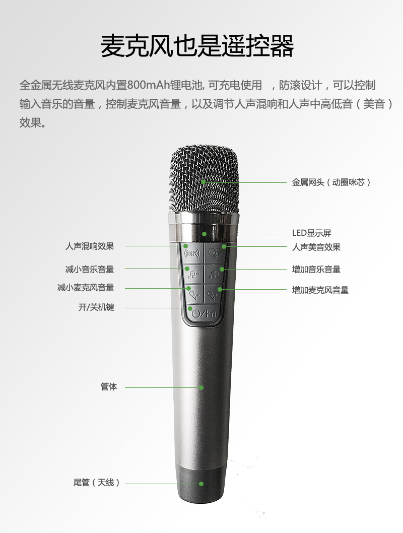 . 双无线带遥控控制麦克风,带6种混响模式可调,6种美音模式